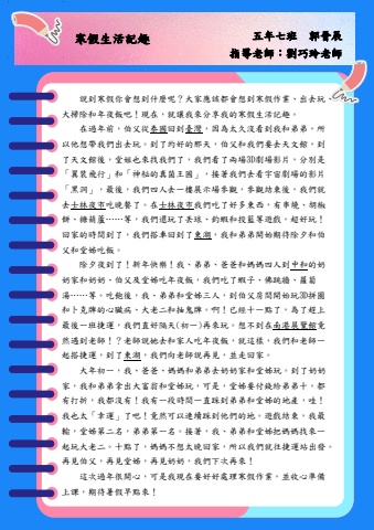 寒假生活記趣五年七班郭晉辰指導老師:劉巧玲老師說到寒假你會想到什麼呢?大家應該都會想到寒假作業、出去玩、大掃除和年夜飯吧!現在,就讓我來分享我的寒假生活記趣。在過年前,伯父從泰國回到臺灣,因為太久沒看到我和弟弟,所以他想帶我們出去玩。到了約好的那天,伯父和我們要去天文館,到了天文館後,堂姐也來找我們了,我們看了兩場3D劇場影片,分別是「翼裝飛行」和「神秘的真菌王國」,接著我們去看宇宙劇場的影片「黑洞」,最後,我們四人去一樓展示場參觀,參觀結束後,我們就去士林夜市吃晚餐了。在士林夜市我們吃了好多東西,有串燒、胡椒餅、糖葫蘆……等,我們還玩了丟球、釣蝦和投籃等遊戲,超好玩!回家的時間到了,我們搭車回到了東湖,我和弟弟開始期待除夕和伯父和堂姊吃飯。除夕夜到了!新年快樂!我、弟弟、爸爸和媽媽四人到中和的奶奶家和奶奶、伯父及堂姊吃年夜飯,我們吃了蝦子、佛跳牆、蘿蔔湯……等。吃飽後,我、弟弟和堂姊三人,到伯父房間開始玩3D拼圖和卜克牌的心臟病、大老二和抽鬼牌。啊!已經十一點了,為了趕上最後一班捷運,我們直好隔天(初一)再來玩。想不到在南港展覽館竟然遇到老師!?老師說她去和家人吃年夜飯,就這樣,我們和老師一起搭捷運,到了東湖,我們向老師說再見,並走回家。大年初一,我、爸爸、媽媽和弟弟去奶奶家和堂姊玩。到了奶奶家,我和弟弟拿出大富翁和堂姊玩,可是,堂姊要付錢給弟弟十,都有打折,我都沒有!我有一段時間一直踩到弟弟和堂姊的地產,哇!我也太「幸運」了吧!竟然可以連續踩到他們的地。遊戲結束,我最輸,堂姊第二名,弟弟第一名。接著,我、弟弟和堂姊把媽媽找來一起玩大老二。十點了,媽媽不想太晚回家,所以我們就往捷運站出發。再見伯父,再見堂姊,再見奶奶,我們下次再來!這次過年很開心,可是我現在要好好處理寒假作業,並收心準備上課,期待暑假早點來!