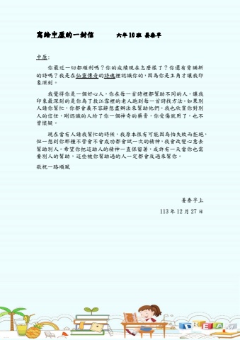 寫給中原的一封信六年10班姜泰孚中原:你最近一切都順利嗎?你的成績現在怎麼樣了?你還有背誦新的詩嗎?我是在仙靈傳奇的詩魂裡認識你的,因為你是主角才讓我印象深刻。我覺得你是一個好心人,你在每一首詩裡都幫助不同的人,讓我印象最深刻的是你為了救江雪裡的老人跑到每一首詩找方法。如果別人請你幫忙,你都會義不容辭想盡辦法來幫助他們。我也欣賞你對別人的信任,剛認識的人給了你一個神奇的藥膏,你受傷就用了,也不曾懷疑。現在當有人請我幫忙的時候,我原本很有可能因為怕失敗而拒絕,但一想到你那種不管會不會成功都會試一次的精神,我會改變心意去幫助別人。希望你把這助人的精神一直保留著,或許有一天當你也需要別人的幫助,這些被你幫助過的人一定都會反過來幫你。敬祝一路順風姜泰孚上113年12月27日