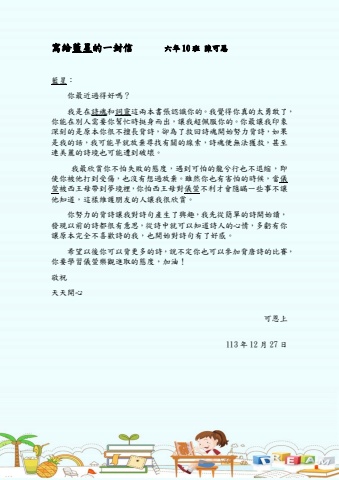 寫給藍星的一封信 六年10班陳可恩藍星:你最近過得好嗎?我是在詩魂和詞靈這兩本書張認識你的。我覺得你真的太勇敢了,你能在別人需要你幫忙時挺身而出,讓我超佩服你的。你最讓我印象深刻的是原本你很不擅長背詩,卻為了救回詩魂開始努力背詩,如果是我的話,我可能早就放棄尋找有關的線索,詩魂便無法獲救,甚至連美麗的詩境也可能遭到破壞。我最欣賞你不怕失敗的態度,遇到可怕的龍兮行也不退縮,即使你被他打到受傷,也沒有想過放棄。雖然你也有害怕的時候,當儀萱被西王母帶到夢境裡,你怕西王母對儀萱不利才會隱瞞一些事不讓他知道,這樣維護朋友的人讓我很欣賞。你努力的背詩讓我對詩句產生了興趣,我先從簡單的詩開始讀,發現以前的詩都很有意思,從詩中就可以知道詩人的心情,多虧有你讓原本完全不喜歡詩的我,也開始對詩句有了好感。希望以後你可以背更多的詩,說不定你也可以參加背唐詩的比賽,你要學習儀萱樂觀進取的態度,加油!敬祝天天開心可恩上113年12月27日